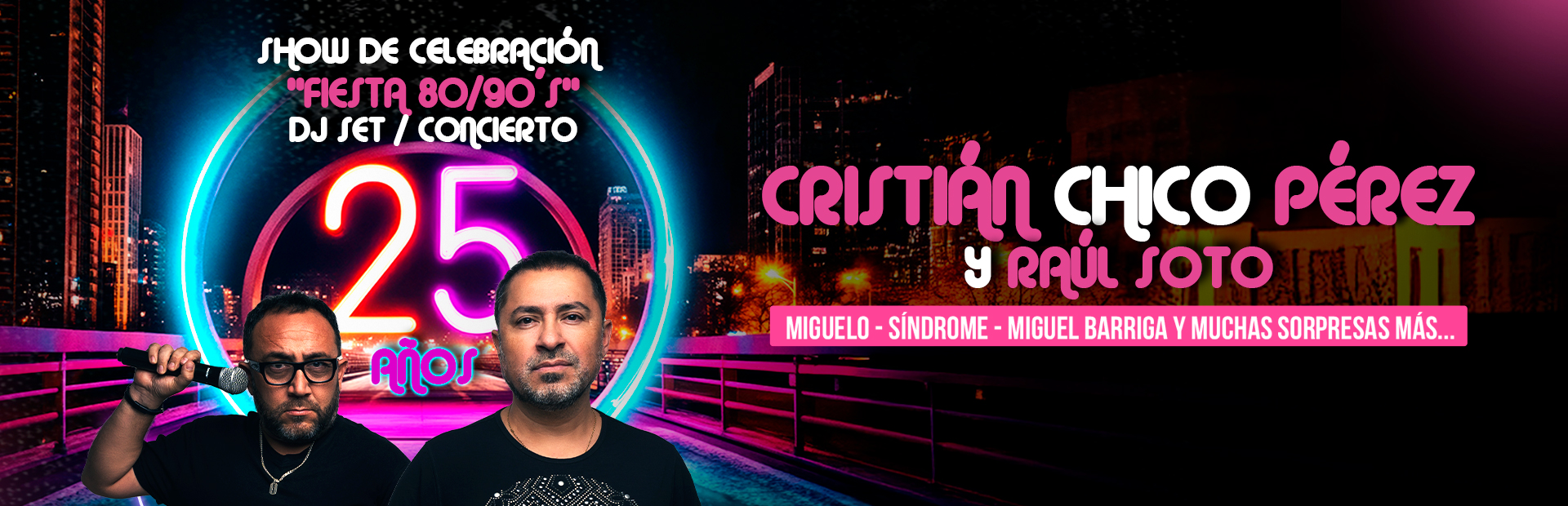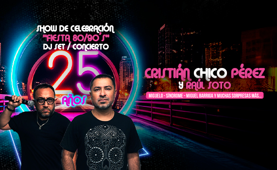 Ha pasado el tiempo y “Chico” Pérez llegará a Gran Arena Monticello para celebrar los 25 años de “La Fiesta 80s y 90s” más exitosa y reconocida de Chile, con un DJ Set/Concierto el próximo sábado 5 de julio desde las 20.30 horas. La presentación del destacado Dj contará con la presencia de tres invitados: Miguelo, Síndrome y Miguel Barriga y las entradas se pondrán a la venta por el sistema Ticketmaster, el próximo lunes 12 de mayo desde las 14.00 horas.